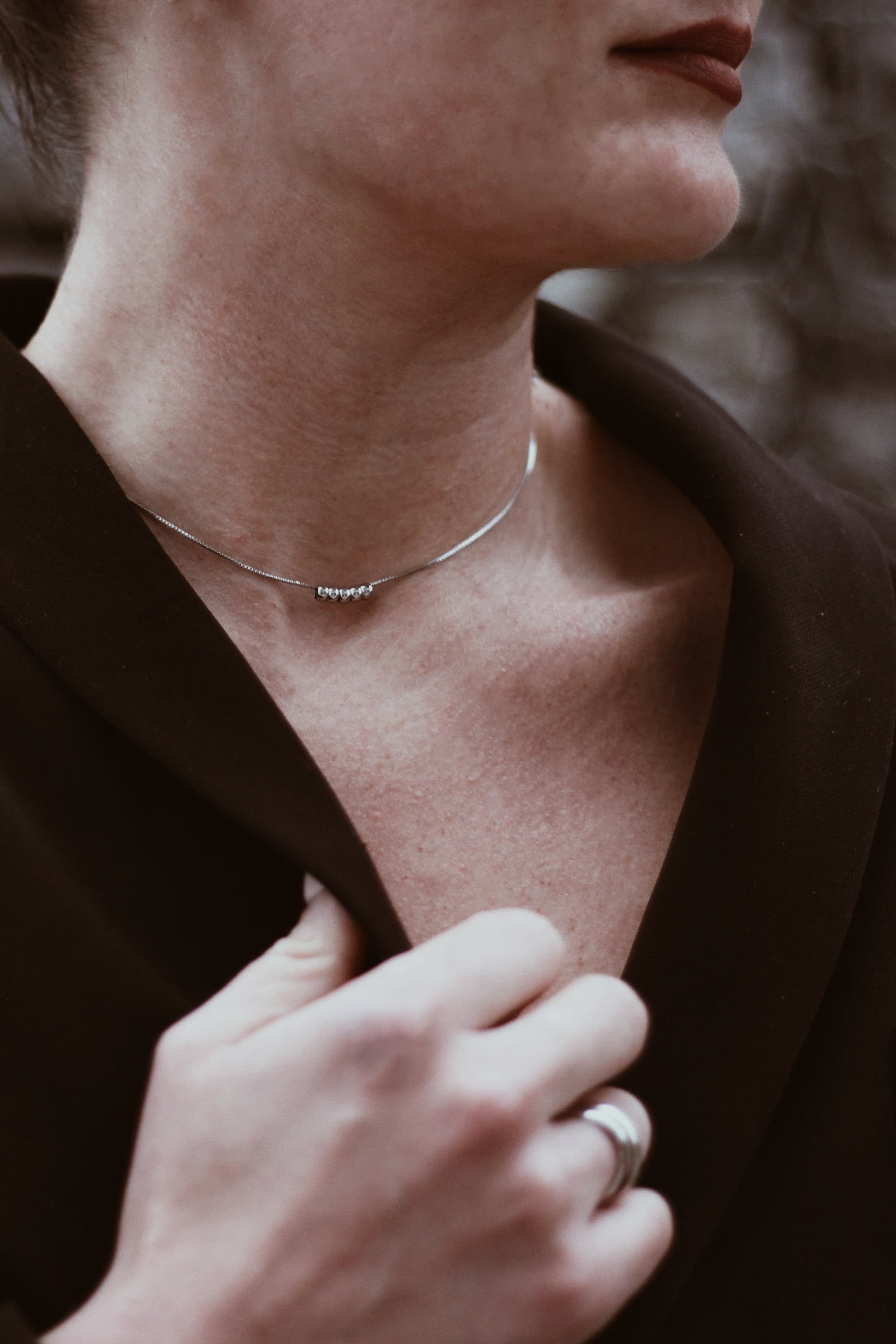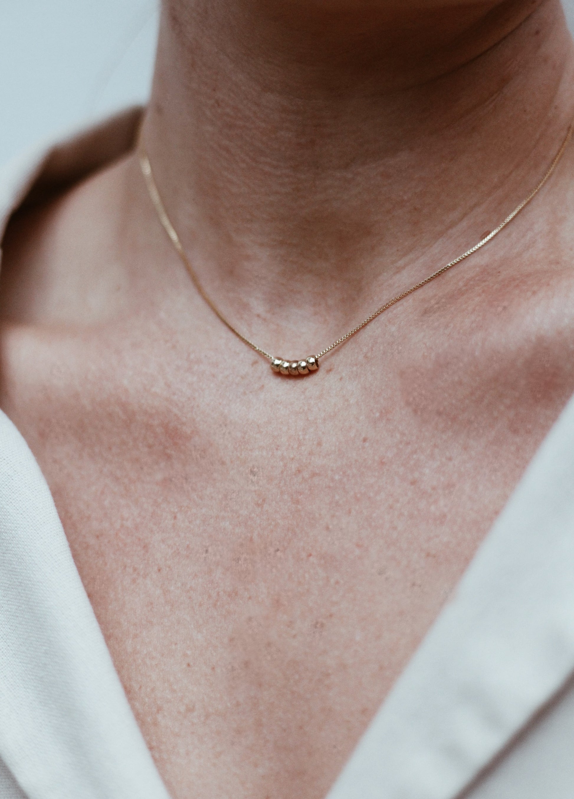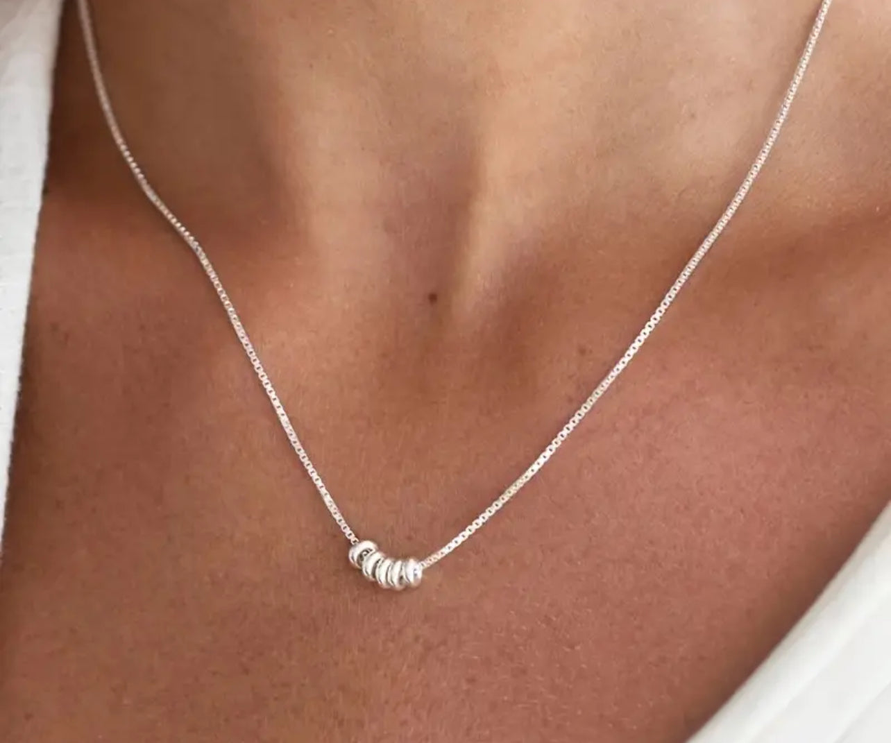 The Starlit Necklace in sterling silver is a quiet triumph of balance and grace. Suspended along a whisper-thin chain are five polished silver rings—each one a symbol of continuity, orbiting the neckline with understated brilliance. The design is intentionally minimal, allowing the craftsmanship and proportions to speak for themselves.